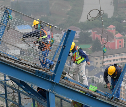 雙柳長江大橋建造過程中搭建貓道,貓道主纜搭建,工人在高空中作業,為了確保工人安全作業,工人需要佩戴防墜器、安全帶等個人保護工具,防止發生高空墜落。